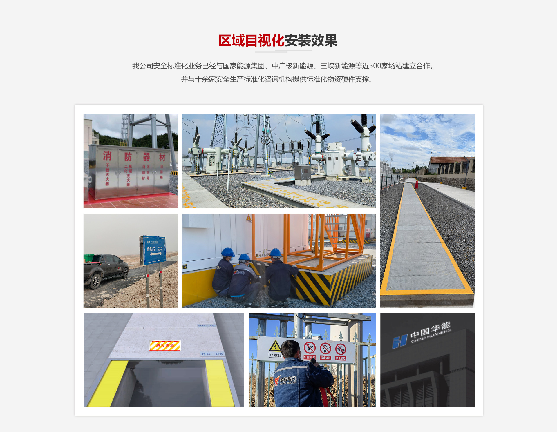 我公司安全標準化業務已經與國家能源集團、中廣核新能源、三峽新能源等近500家場站建立合作,并與十余家安全生產標準化咨詢機構提供標準化物資硬件支撐。